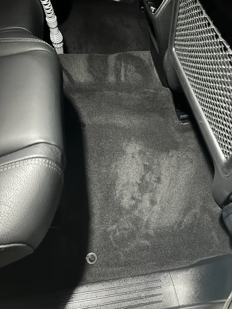 ベンツ GLEのような大型SUVでは、シートのクッションが厚く、内部に湿気や汚れが溜まりやすい構造になっています。また、足元マット周辺は段差や隙間が多く、液体が流れ込むと臭いが長期間残りやすい傾向があります。