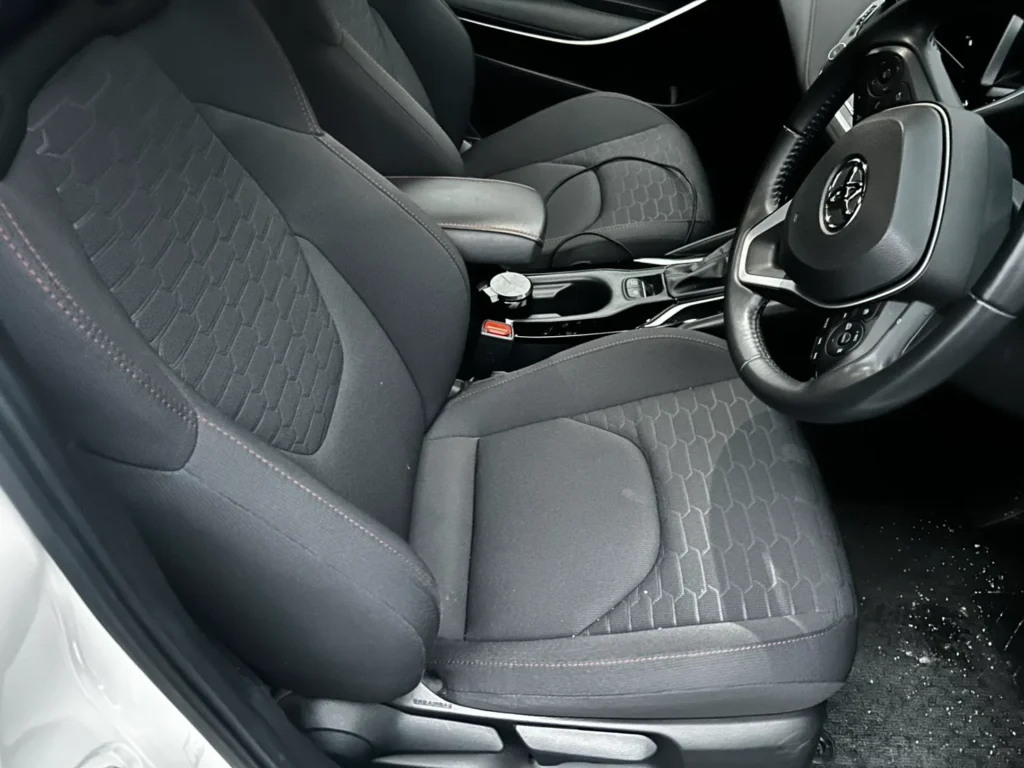 クルピカ24では、車内全体清掃としてシート全体の洗浄、床・フロア清掃、内装パネルの拭き取りを実施しました。シートは部分的な対応ではなく全体を均一に整えるように作業を行い、端部や縫い目も含めて状態を確認しながら対応しています。