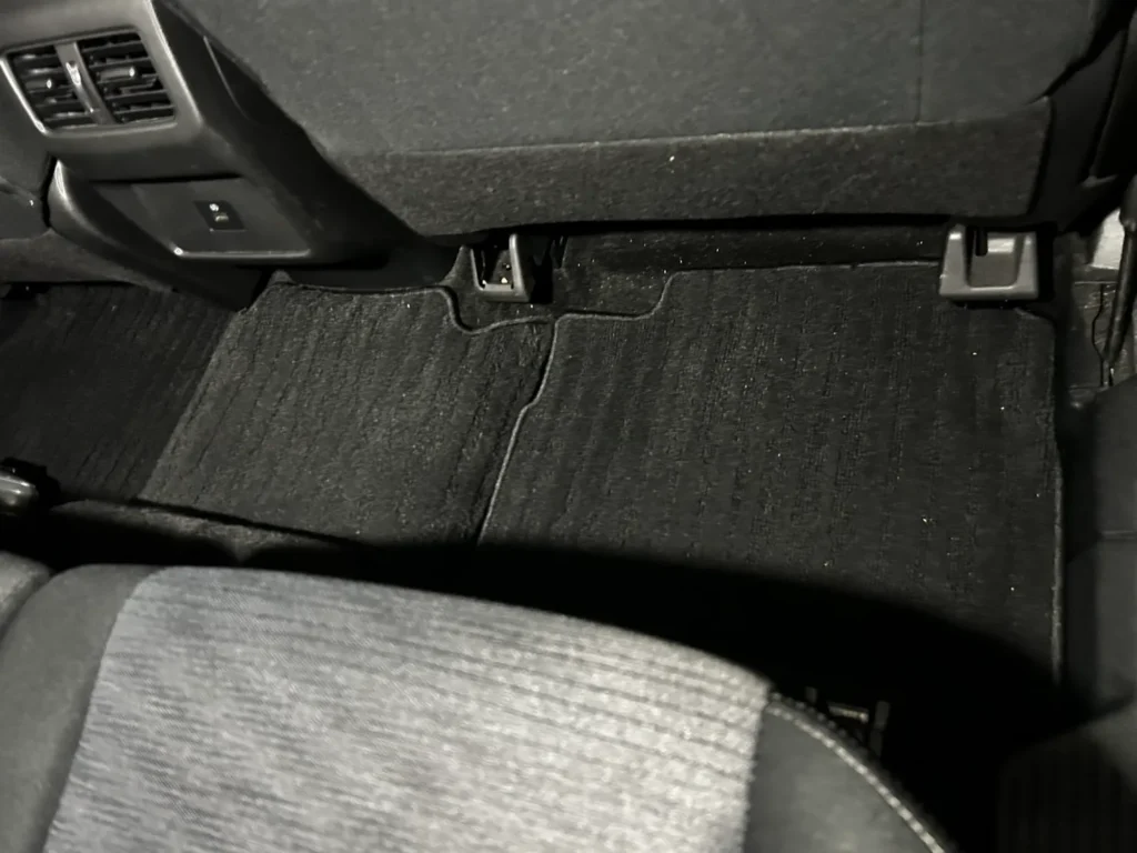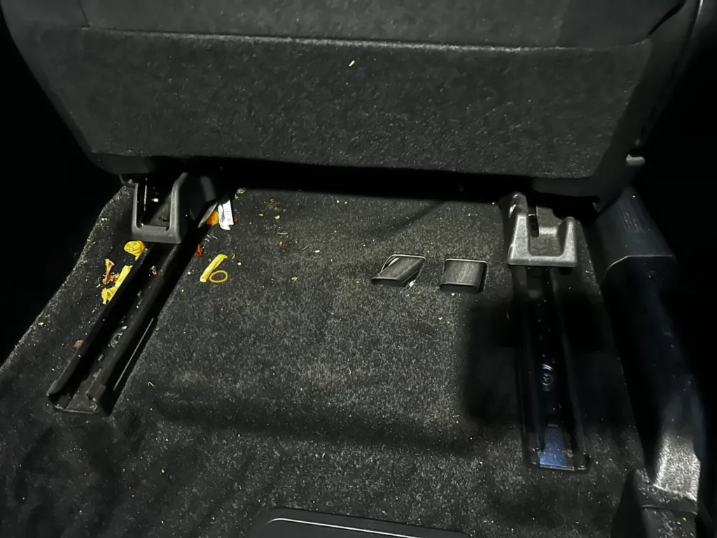 運転席および後部座席のフロアには、細かなゴミや食べ物の残りが確認できる状態でした。特に後部座席の足元は、シート下の構造上、汚れが溜まりやすく見落とされやすい箇所です。
