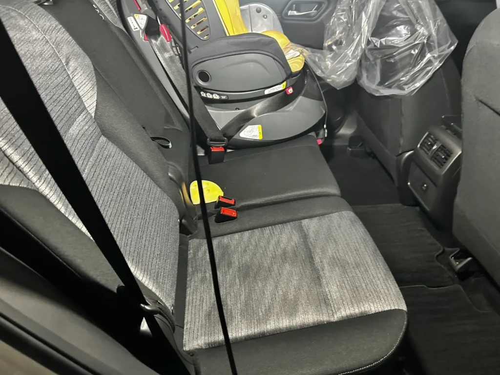 後部座席にはチャイルドシートが設置されており、その周辺にも汚れが確認できる状態でした。チャイルドシートの周囲は、飲食物や汚れが落ちやすく、シートとの隙間に入り込むケースが多く見られます。
