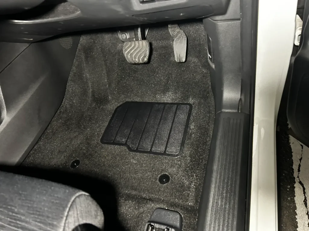 クルピカ24では、フロア全体の清掃を行い、目に見えるゴミだけでなく、繊維の中に入り込んだ細かな汚れも含めて対応しています。運転席の足元についても同様に清掃を行い、ペダル周辺やマット部分の汚れを取り除いています。
