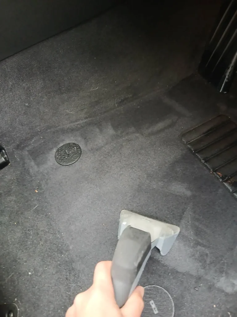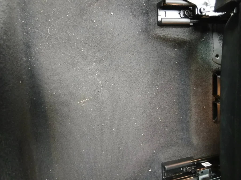 後部座席足元も掃除機掛けを行い、細かなゴミや破片を取り除きました。シート下の奥まで確認しながら清掃を行っています。