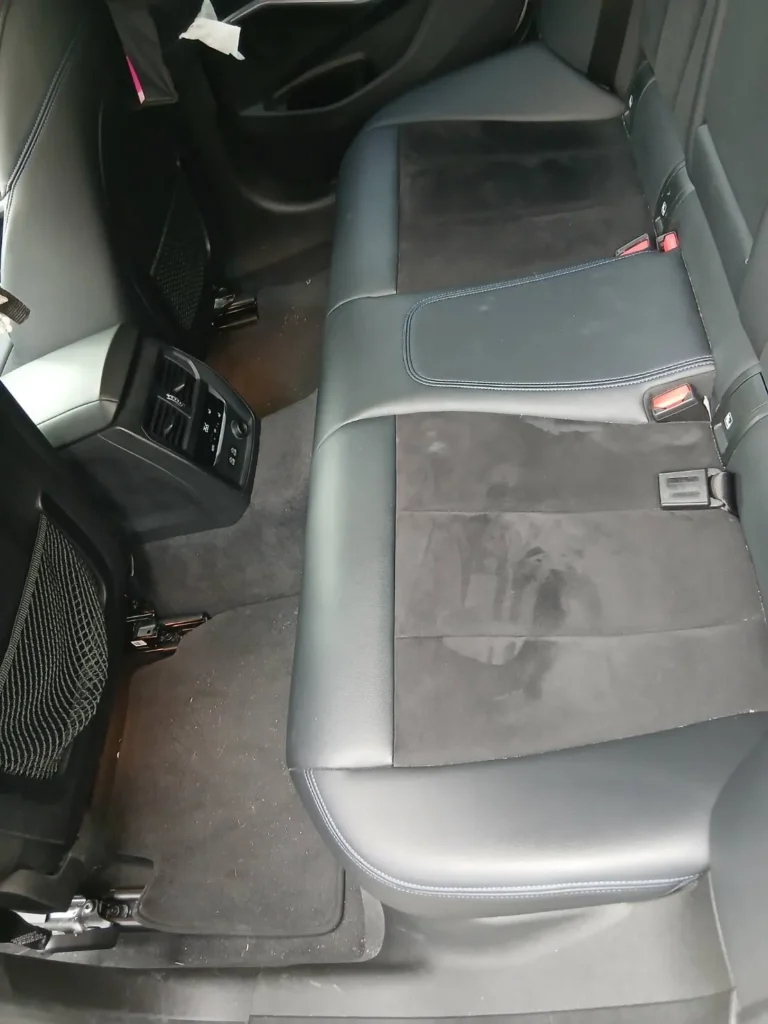 助手席の座面は、中央に広がっていたシミが落ち着き、全体の色味が整いました。液体が広がっていた範囲も目立ちにくくなり、表面の質感が均一に見える状態です。