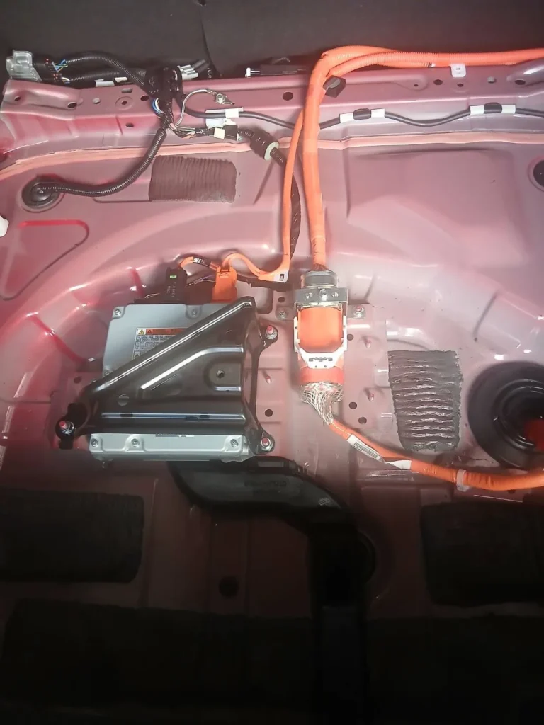 現地確認では、トランク内部のパネルを取り外した状態で、スペアタイヤ収納部やその周辺の構造部分が露出している状態でした。内部には配線や部品が通っており、灯油が入り込んでいる可能性がある箇所も確認できる状況です。