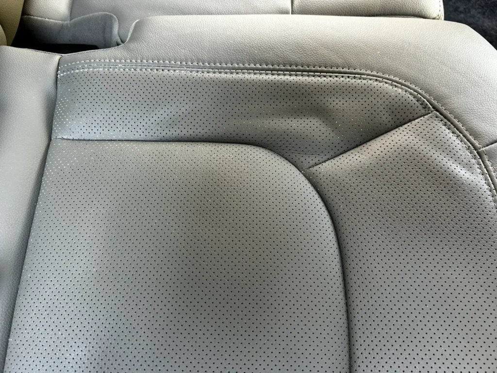 後部座席のシートはパンチングレザー素材で、表面には細かな穴があり、液体が入り込みやすい構造となっています。確認時には、座面中央から縫い目周辺にかけて汚れの付着が見られ、部分的ではなく広範囲に影響している状態でした。