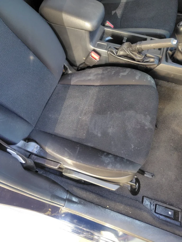 施工前の運転席を見ると、座面中央から太もも付近にかけて、広い範囲に白っぽくムラになった跡が確認できます。拭き取ったあとに乾燥し、輪ジミのように残っている状態です。
