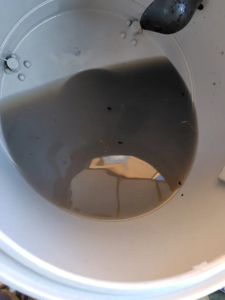 実際に回収した汚水は、写真の通りかなり濁っています。見た目以上に内部に成分が残っていたことがわかります。