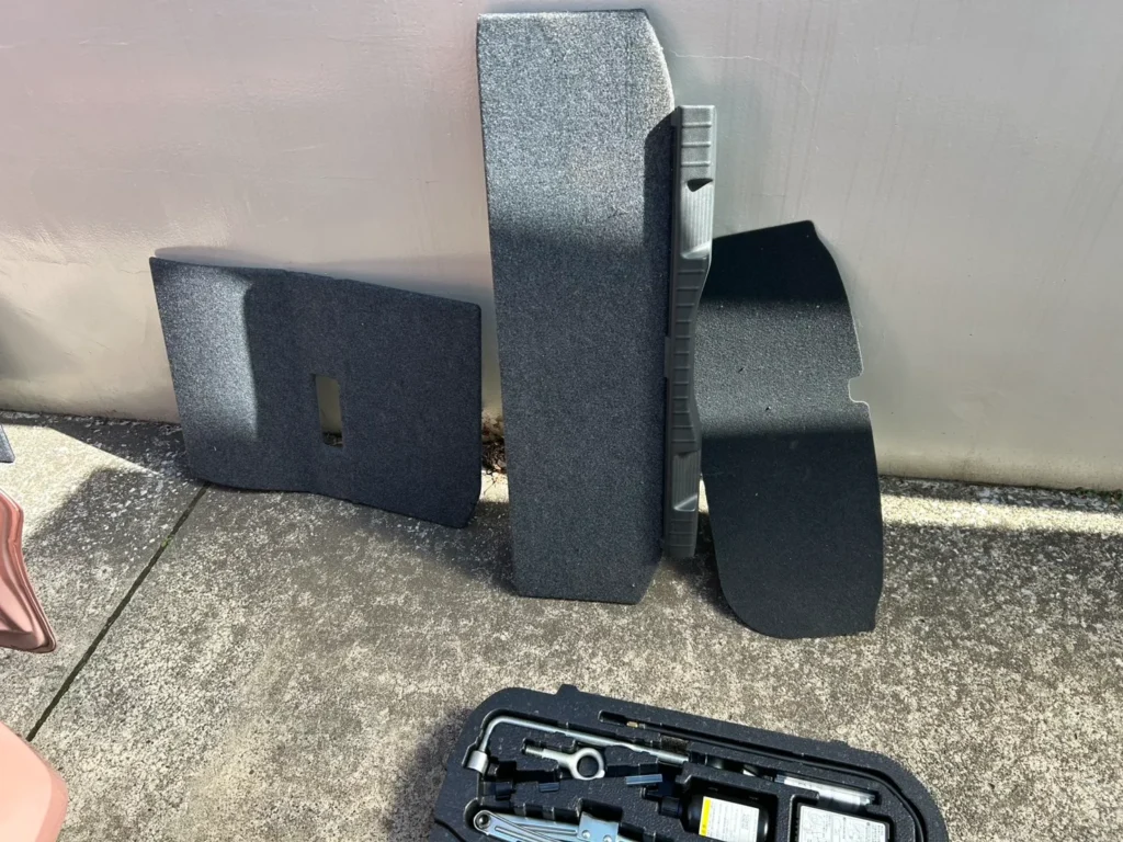 トランクスペースは床パネルを取り外し、内部に入り込んでいたゴミを吸引しました。取り外したパーツは屋外で並べて確認し、それぞれの表面を清掃しています。