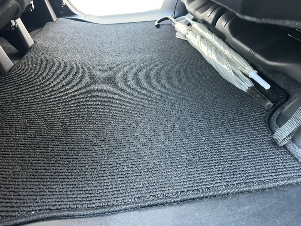 トランク床面のマットも清掃を行い、繊維の間に入り込んでいた細かなゴミを取り除きました。清掃後は床面全体の繊維が均一に整った状態になっています。