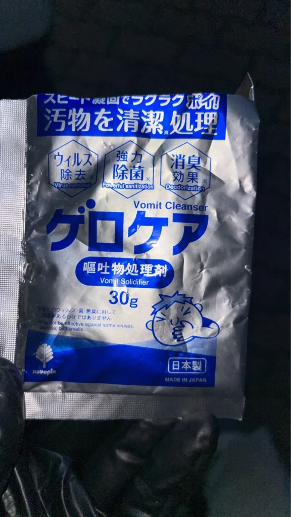 今回のケースでは、嘔吐後にお客様ご自身での処理はされておらず、現場にて担当が市販の処理剤(ゲロケア)を使用し、初期対応を行いました。