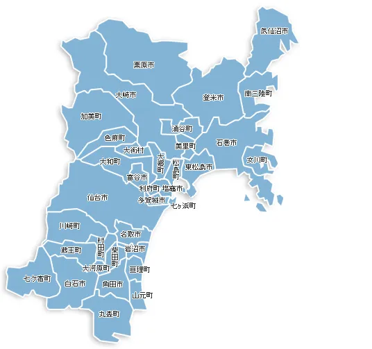 仙台市 青葉区 宮城野区 若林区 太白区 泉区 石巻市 塩竈市 気仙沼市 白石市 名取市 角田市 多賀城市 岩沼市 登米市 栗原市 東松島市 大崎市 富谷市 刈田郡 蔵王町 七ヶ宿町 柴田郡 大河原町 村田町 柴田町 川崎町 伊具郡 丸森町 亘理郡 亘理町 山元町 宮城郡 松島町 七ヶ浜町 利府町 黒川郡 大和町 大郷町 大衡村 加美郡 色麻町 加美町 遠田郡 涌谷町 美里町 牡鹿郡 女川町 本吉郡 南三陸町