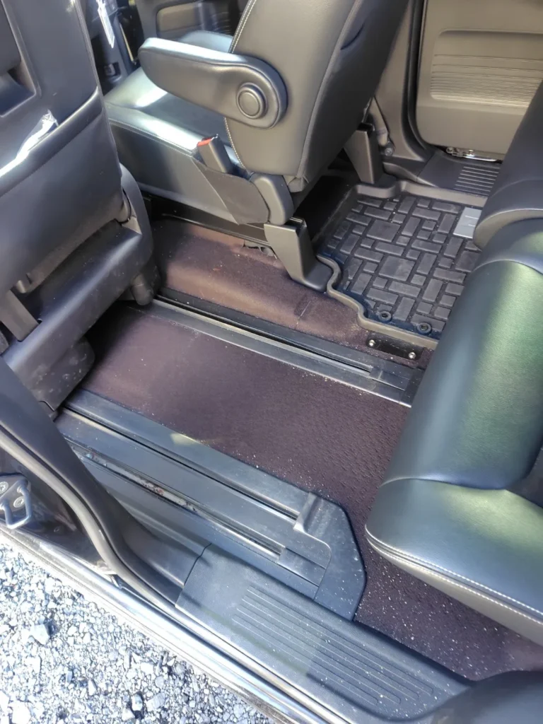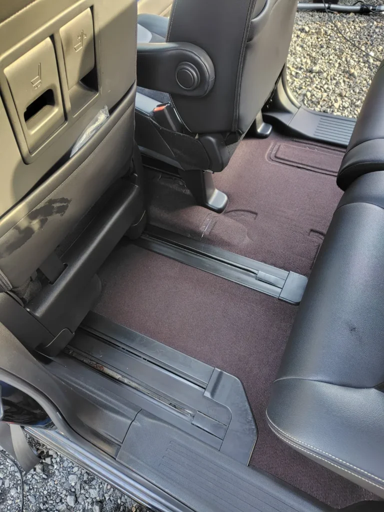 後部座席付近では、シート下から足元にかけて、カーペットの色ムラや汚れが残っている状態でした。スライドドアのレール周辺や段差部分にも、細かなゴミや付着物が見られます。