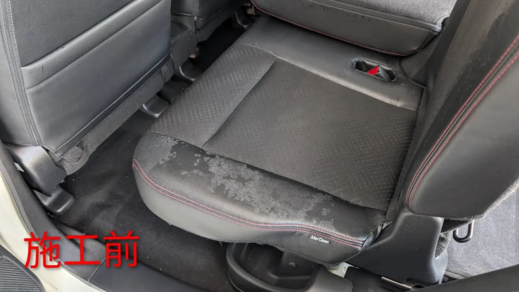 後部座席の座面には、ペットの糞尿による跡が広がっていました。部分的に濃くなっている箇所があり、繊維の奥まで入り込んでいる可能性が高い状態です。表面は乾いていても、内部に残っているケースは少なくありません。