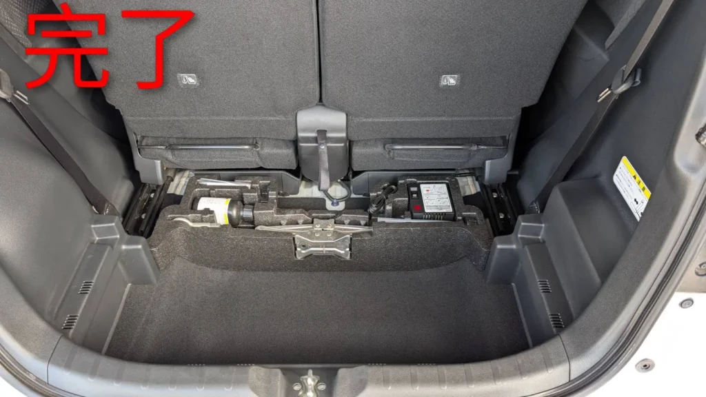 運転席・助手席周辺も拭き上げを行い、内装パネルやフロアの印象も整いました。トランクスペースもすっきりとした状態です。