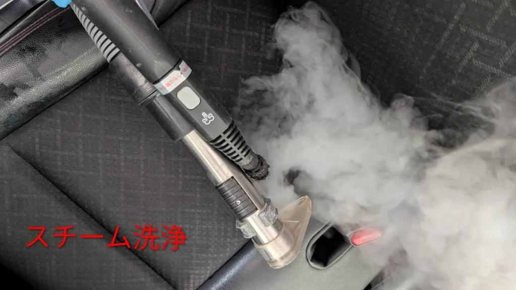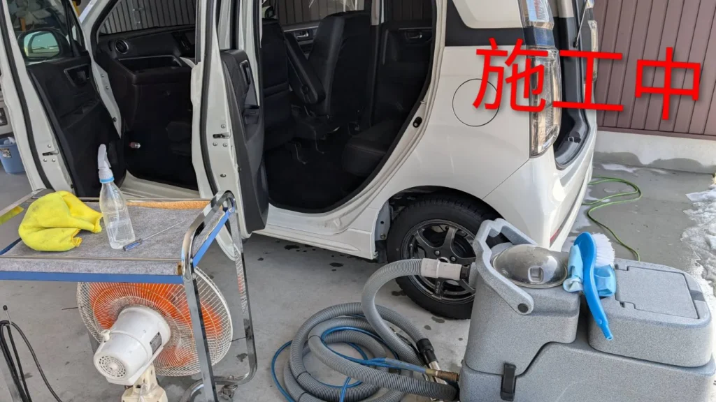 後部座席は洗浄液を浸透させたうえで、リンサークリーナーで吸引洗浄を行いました。