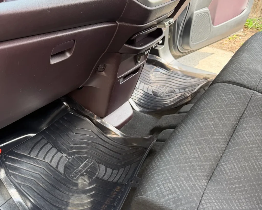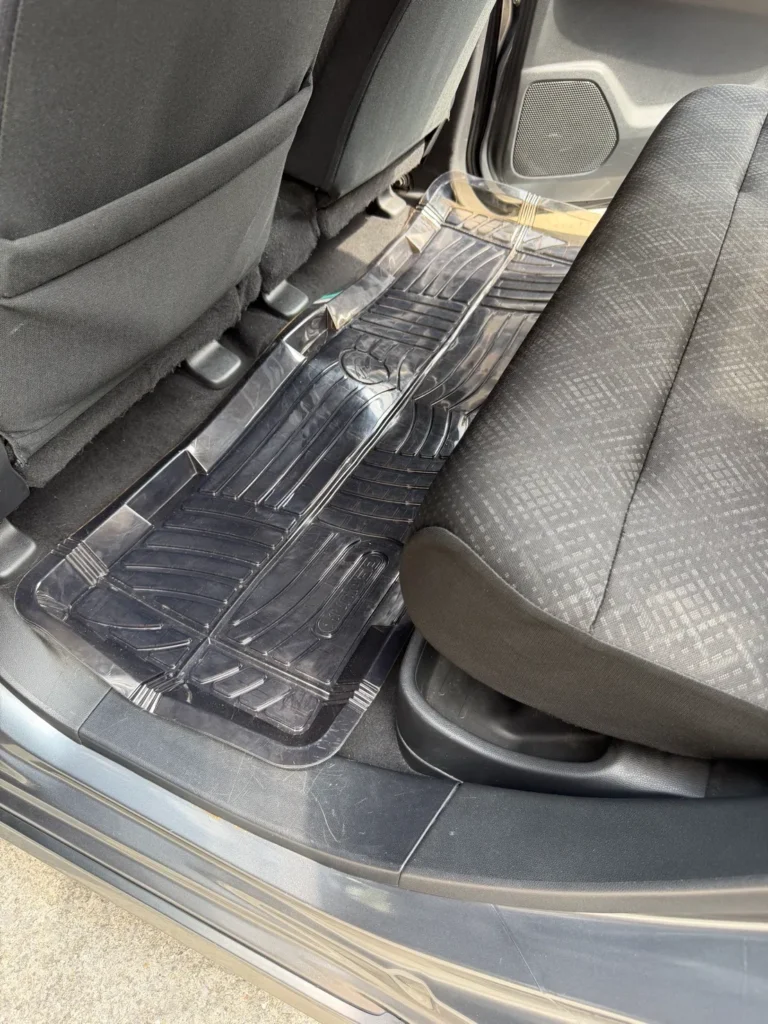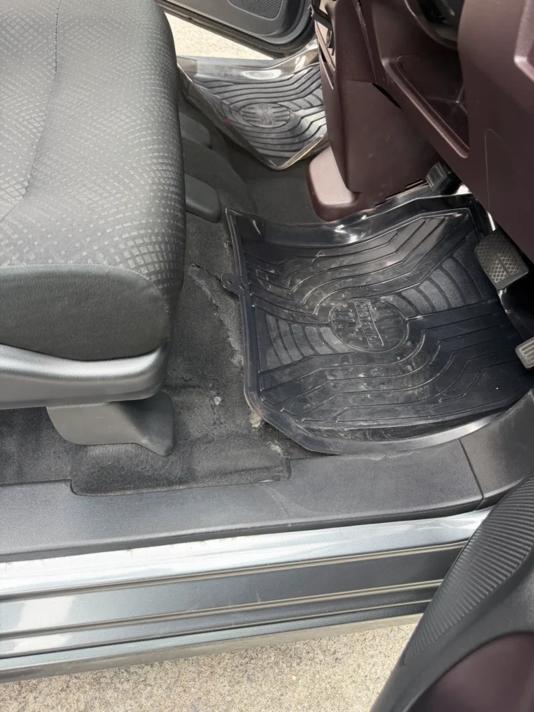 後部座席の足元でも同様に、マットの下や周辺に粉状の汚れが確認でき、車内全体に広がっている様子でした。
