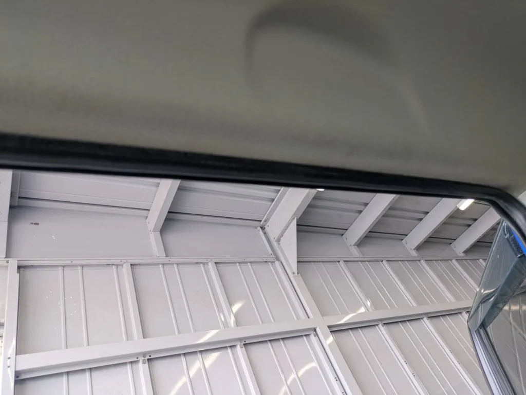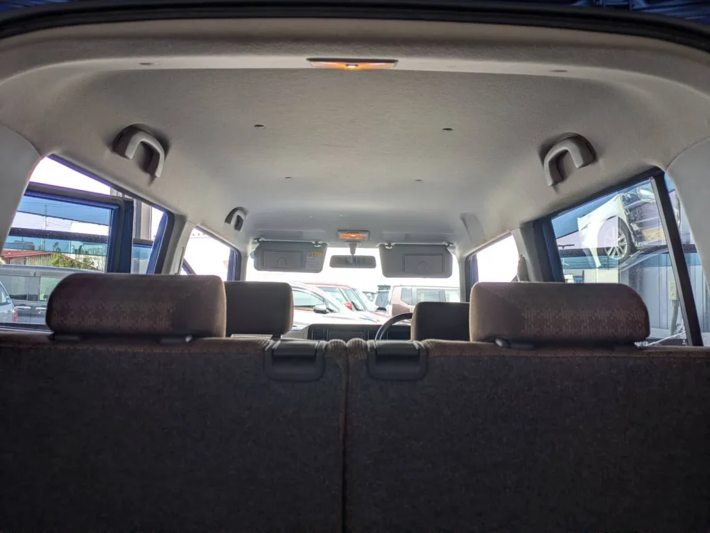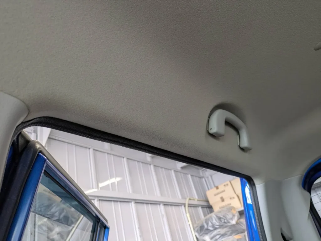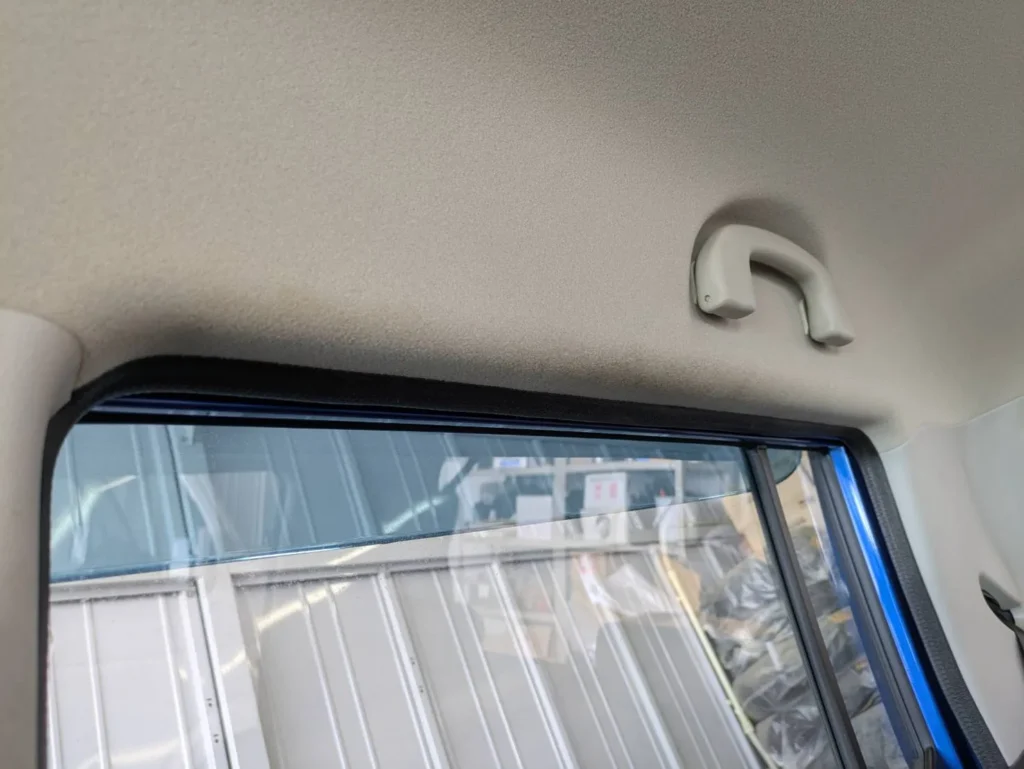 天井の内張りには、全体的に薄く黄ばみが広がっており、部分的に濃くなっている箇所も確認できました。特にドア開口部付近は色の差がはっきりしており、タバコの煙が長期間蓄積していたことが分かる状態です。