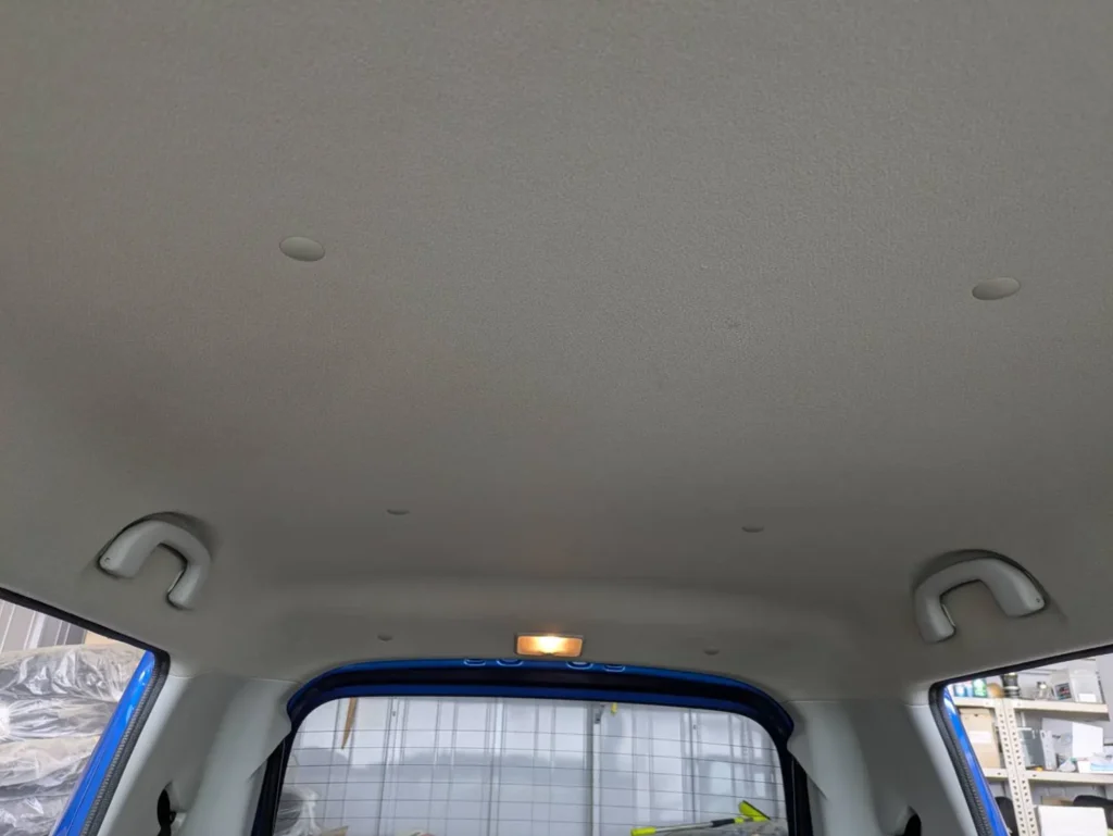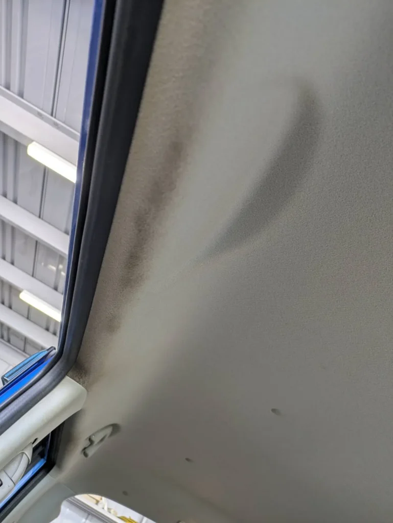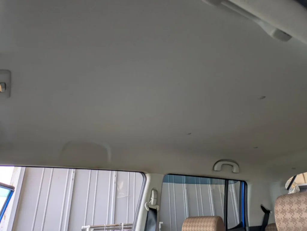 後部座席まわりの天井にも同様に、うっすらとした色の変化が広がっており、全体に均一ではない状態でした。