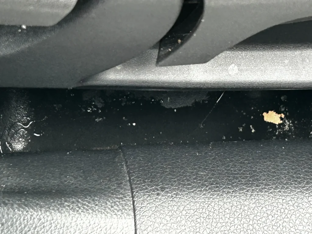 現地確認時、助手席のフロアマットに明確な汚れと湿り気があり、周辺にも液体が広がった形跡が見受けられました。