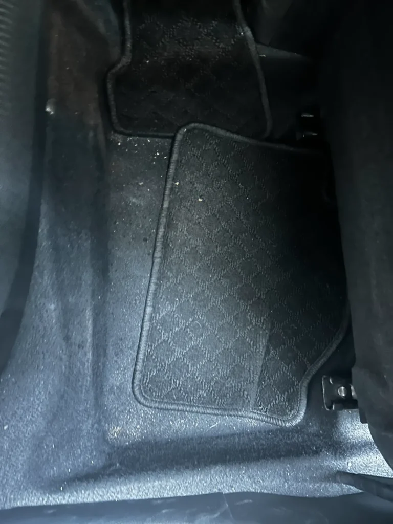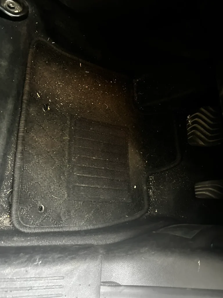 運転席・後部座席ともに、マットの凹凸部分に汚れが入り込んでおり、単純な掃除では取り切れない蓄積が見られます。