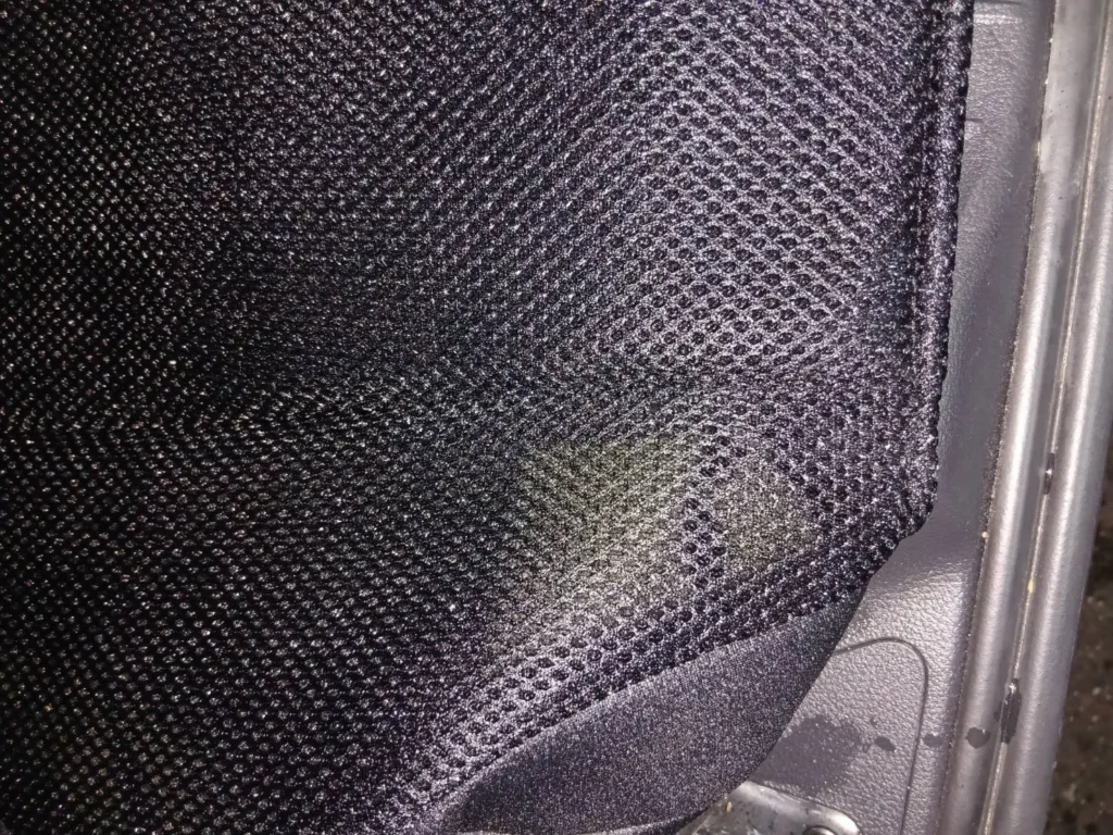 後部座席のシートには、表面に変色した跡が見られ、部分的に濡れたような広がりが確認できる状態でした。座面の縫い目や側面付近にも汚れが入り込んでおり、表面だけではなく内部にまで影響している様子が見受けられました。さらに、シートの隙間や端部には固形物の付着も確認でき、汚れが一点に留まらず広がっている状態でした。