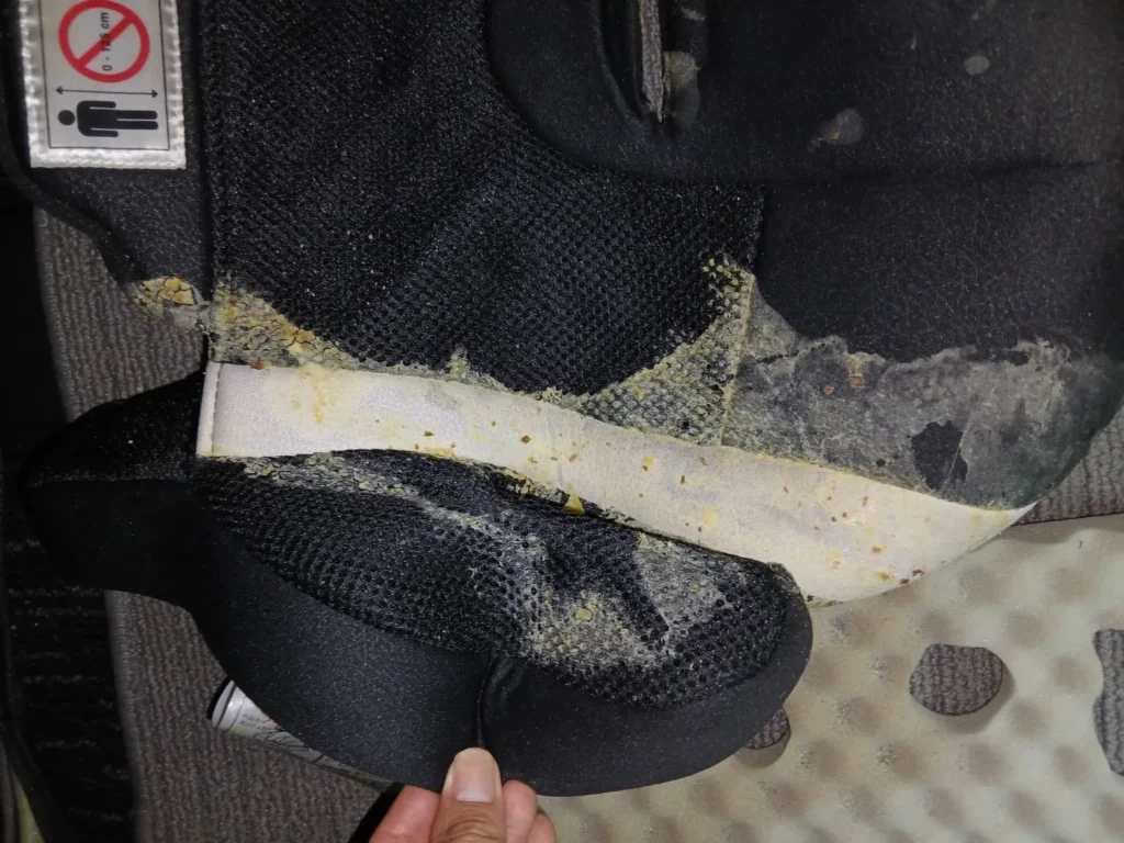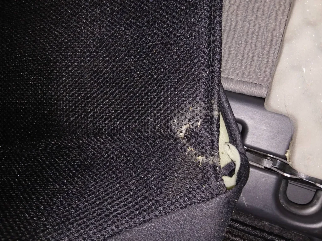 チャイルドシートについては、表面だけでなく内部にまで汚れが入り込んでいる状態でした。カバーの隙間や内部のクッション部分にまで付着物が確認でき、分解しない状態でも内部に影響が及んでいることがわかる状況でした。特に下部のクッション部分には広範囲にわたって汚れが見られ、通常の表面清掃では対応しきれない状態でした。