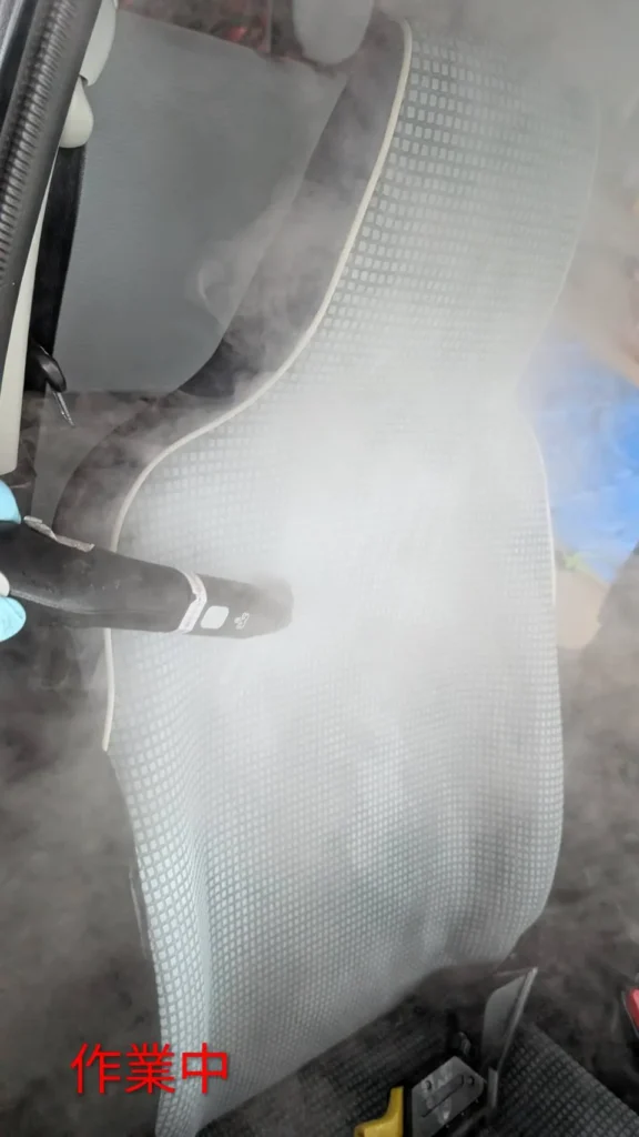 写真は、実際に俺たちがスチームノズルをシート表面に当てながら清掃している最中の様子です。