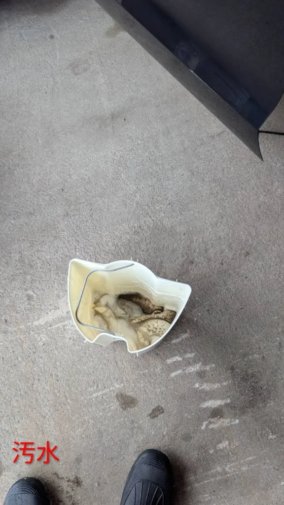 一見するときれいに見えていた運転席シートですが、洗浄後に回収された水には、はっきりと濁りがあり、内部に蓄積していた汚れが確実に存在していたことが分かります。