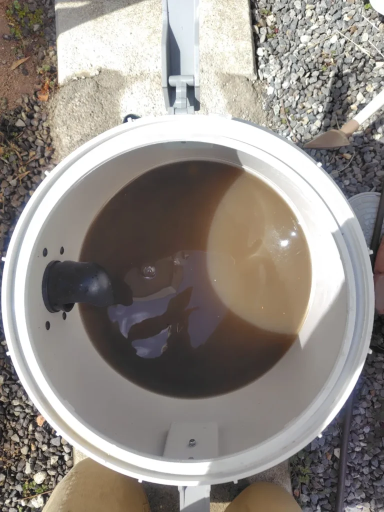 作業中に回収した汚水も濁りが強く、全体に蓄積していた汚れの量がはっきりと確認できる状態でした。