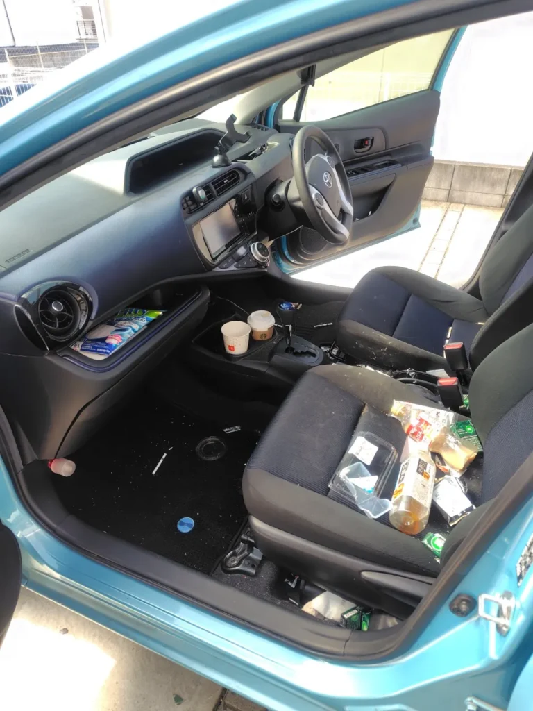 茨城県つくば市にて、トヨタ・アクアの車内全体清掃を行いました。車内には日常使用によるゴミが広範囲に蓄積しており、シートや足元を中心に臭いも感じられる状態でした。実際に現場に入ると、想像していた以上にゴミの量が多く、作業の進め方を整理しながら対応する必要がある状態でした。