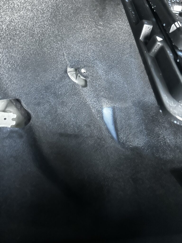 シート固定用の金属部や溝部分にも、灯油が流れ込んだ形跡が見られました。