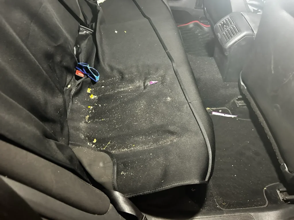 チャイルドシート付近のお子様の食べ飲みこぼしの清掃。日常使いによって蓄積した汚れをリセットした一例