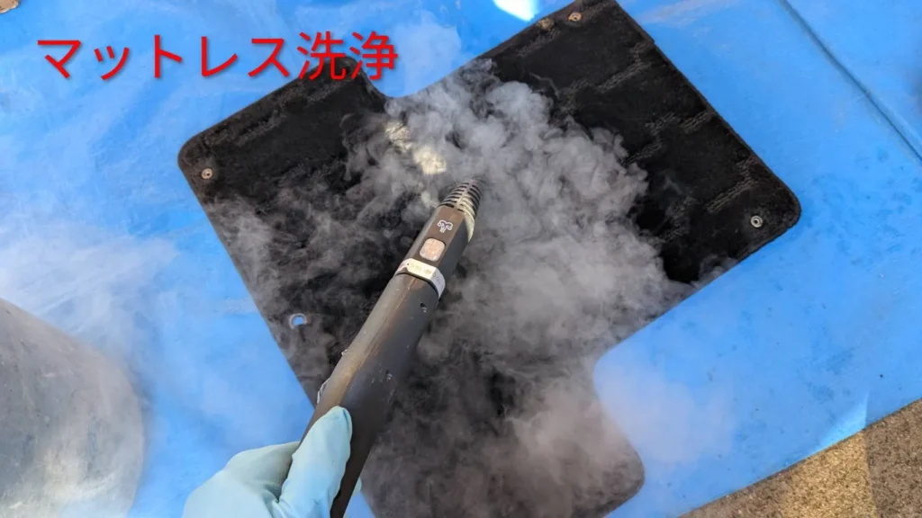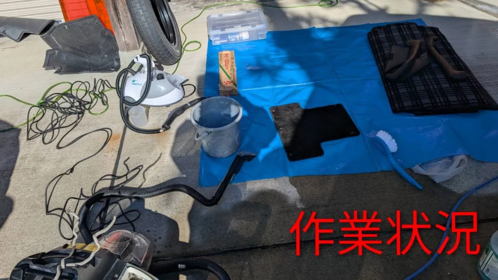 今回の作業では、フロアマットにも嘔吐物が付着していたため、取り外したうえでスチーム洗浄を実施しました。